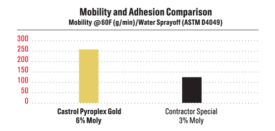 Castrol Pyroplex Gold and Castrol Pyroplex Blue use exclusive Hydro-Activation technology which increases tack and adhesion while maintaining mobility during wet and highly humid conditions.