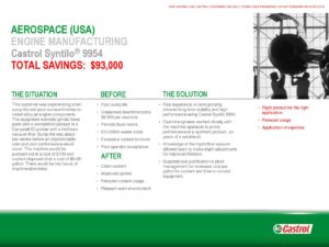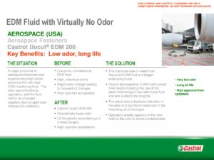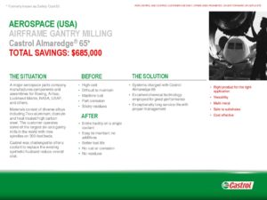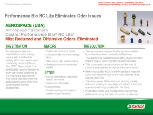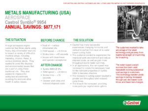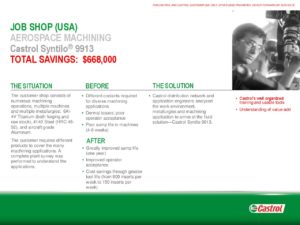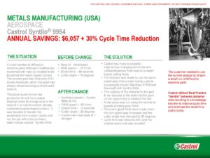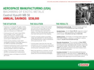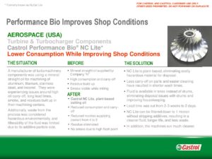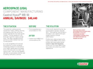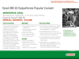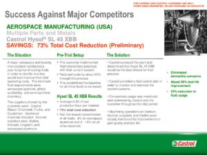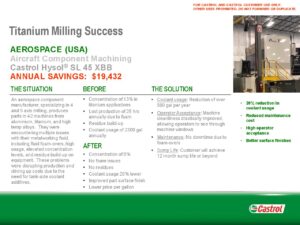 Hysol SL 45 XBB CS-AEAE-124Hysol SL 45 XBB (Aerospace) Titanium milling CS-AEAE-124 Application: Titanium milling in Makino T2s, producing F-15 fuel doors Key Benefits: Low foam, reduced fluid usage, eliminated downtime, lower concentration, eliminated residues. |