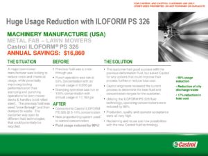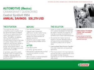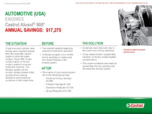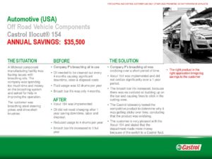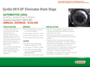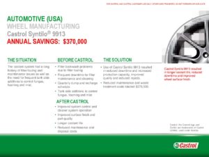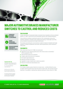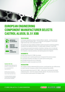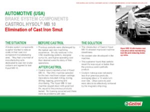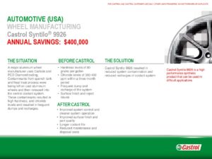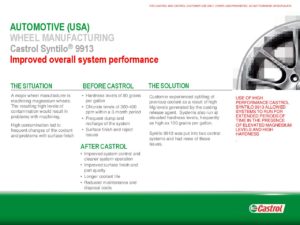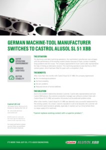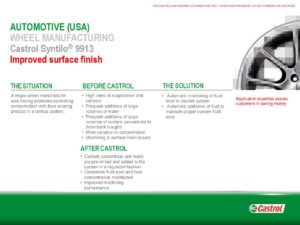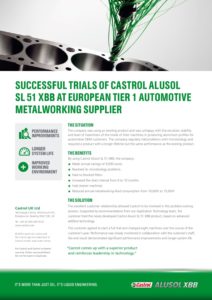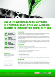 Alusol SL 51 XBBAlusol SL 51 XBB (Automotive) Aluminum Brake Components CS-AUTC-123 Application: Aluminum 6082, Brake components Key Benefits: Same performance at lower concentration, cleaner work environment, Eliminated foam, Sped up production, Reduced usage, Reduced downtime, Eliminated additives |