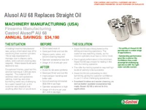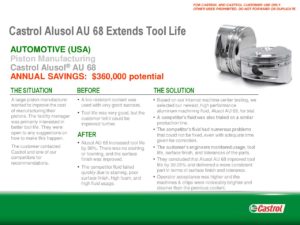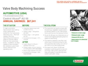 Alusol AU 68Alusol AU 68 (Automotive) Aluminum Valve Bodies CS-AUTC-114 Application: Tapping, milling, reaming, Aluminum 380, Transmission valve bodies Key Benefits: Lower coolant usage, better tool life, lower water usage. |