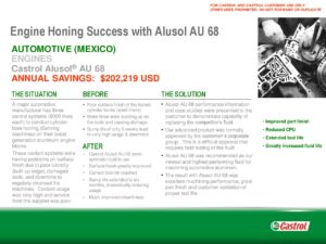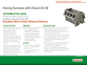 Alusol AU 68Alusol AU 68 (Automotive) Cylinder Bore Honing CS-AUEN-130 Application: Honing, Aluminum blocks, steel liners, Engine blocks, Gehring, Permanent media and paper Key Benefits: Longer sump life, longer tool life, better finish, better cleanliness. |
