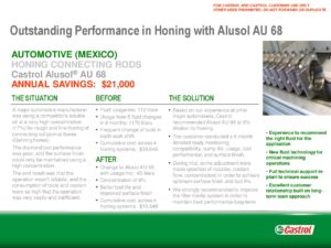 Alusol AU 68Alusol AU 68 (Automotive) Honing Con Rods CS-AUEN-129 Application: Two-pass honing, Powdered metal, forged, Connecting rod hone, Gehring RS 4-400-63 , Gravity paper 1.8 micron Key Benefits: No foam, excellent surface finish, lower usage, longer tool life. |