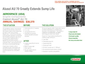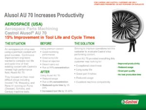Alusol AU 70Alusol AU 70 (Aerospace) Inconel Creep Feed Grinding CS-AEAE-117 Application: Creep feed grinding, Inconel, Turbine blades, Blohm, Micron, Hydroflow vacuum Key Benefits: Reduced machine rust/residue (better overall machine compatibility), equal grinding performance, longer sump life, eliminated odors. |