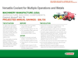 Alusol AU 70Alusol AU 70 (Agriculture) Multi-Metal-Operation Machining CS-MMAC-110 Application: Drilling, milling, turning, tapping, grinding., Steel 1000 & 4000 series, Cast iron, Alum 6000 series, Stainless 300 series, Multiple components for planters and cotton harvesting equip, chip drags, paper filter beds. Grinding system has DE Smith gravity bed. Key Benefits: Reduced usage, eliminated chlorine, lower concentration with equal results, cleaner machines. |