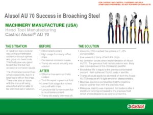 Alusol AU 70Alusol AU 70 (Hand Tool Manufacturing) Steel Broaching CS-MMOT-111 Application: Steel (1000, 4000, A2) Key Benefits: Better cleanliness & tramp removal. |