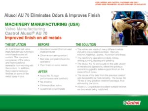Alusol AU 70Alusol AU 70 (Machinery Manufacture) Multi-metal Valve Machining CS-MMOT-120 Application: Milling, Drilling, Turning, Turning, Tapping, Grinding, Steel, Stainless, Titanium, Inconel, Hastelloy, Stellite, Aluminum, Brass, Ball valves Key Benefits: Eliminated odors, improved finish, eliminated chlorine. |