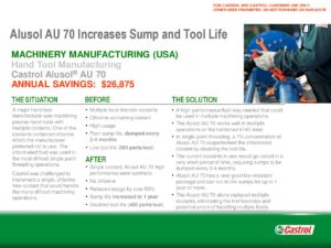 Alusol AU 70Alusol AU 70 (Machinery Manufacture) Steel Hand Tools CS-MMOT-121 Application: Milling, Turning, Drilling, Single point threading, Broaching, Steel 4140, Torque measuring products, calibrating equip, specialty tools, Cartridge 25 micron Key Benefits: Longer sump life, eliminated chlorine, lower usage. |