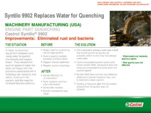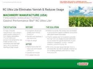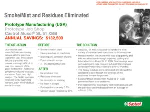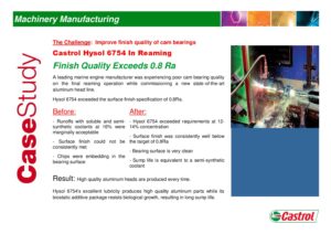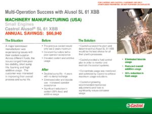 Alusol SL 61 XBBAlusol SL 61 XBB (Machinery Manufacture) Small Engine Machining CS-MMSE-103 Application: Boring, honing, drilling, tapping of aluminum blocks with cast iron sleeves Key Benefits: Lower coolant usage, lower additive usage, reduced foam, longer sump life, eliminated odors |