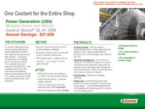 Alusol SL 61 XBBAlusol SL 61 XBB (Power Generation) Multi-Metal Machining CS-MMOT-131 Application: Rough milling, turning, grinding, Inconel, Aluminum, Stainless, Various, Mazak, Chip drag and cartridge Key Benefits: Increased tool life, low make-up rate, lower usage, eliminated odors, cleaner running |