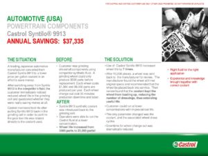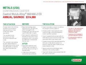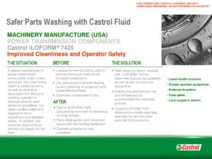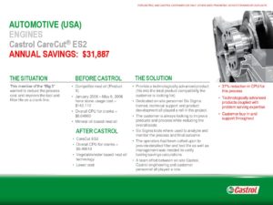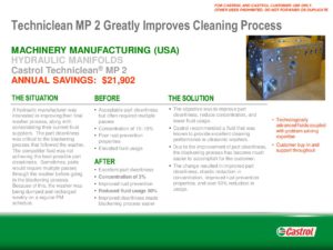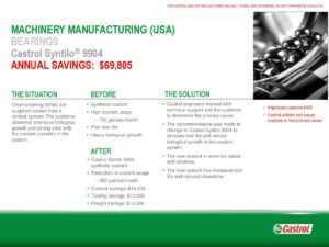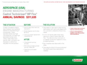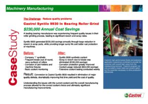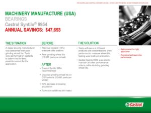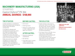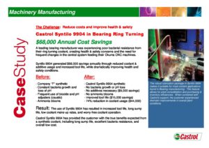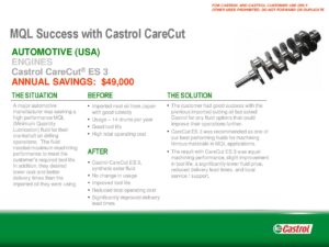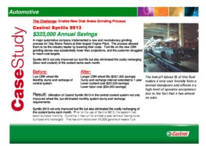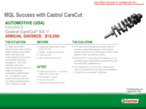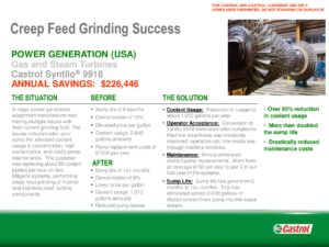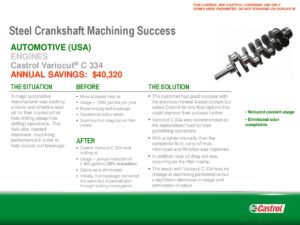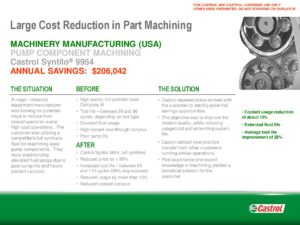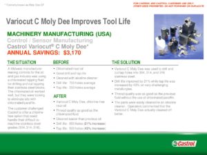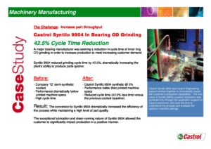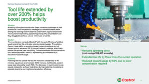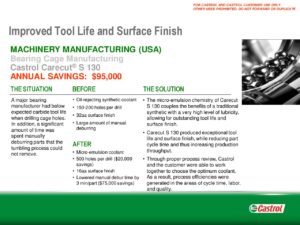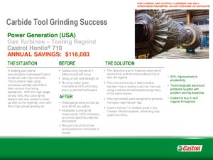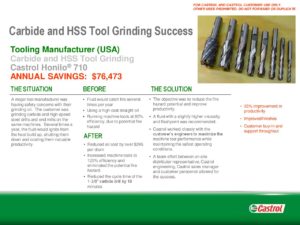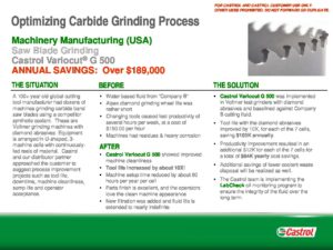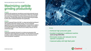 Maximizing carbide grinding productivity - Castrol® Product ML 0001Maximizing-carbide-grinding-productivity Application: Drilling, Reaming, Heat treated carbon steel, Engine components Key Benefits: Extended tool life by 3X, lower coolant usage by 69%, reduced rework. |