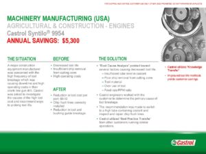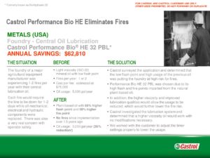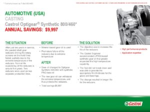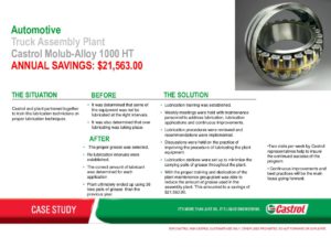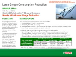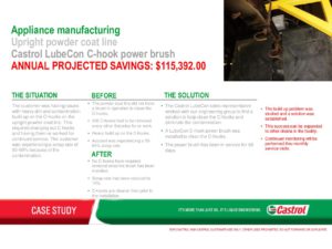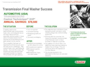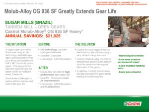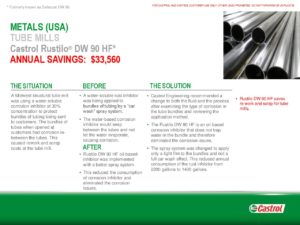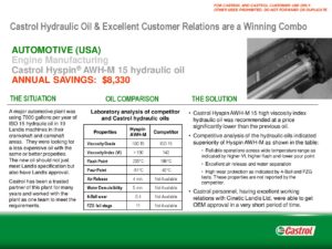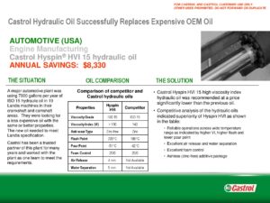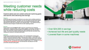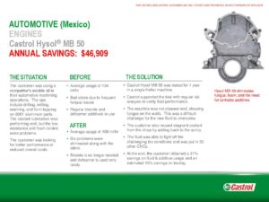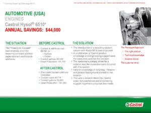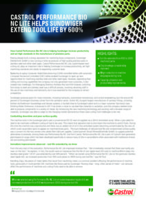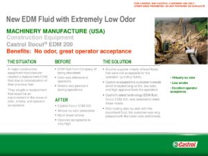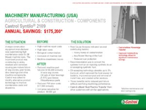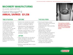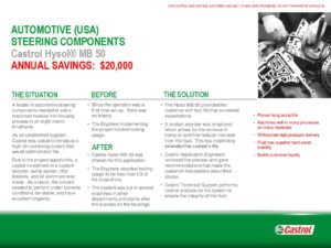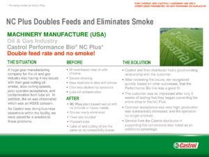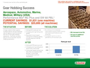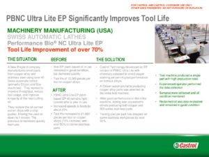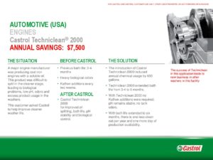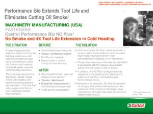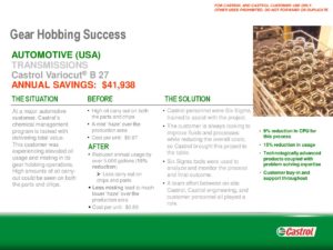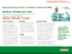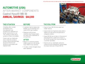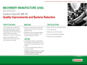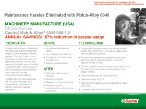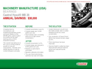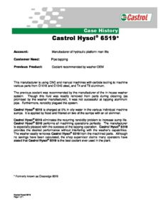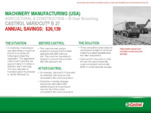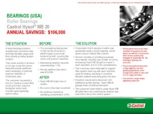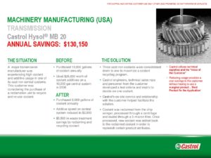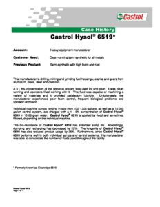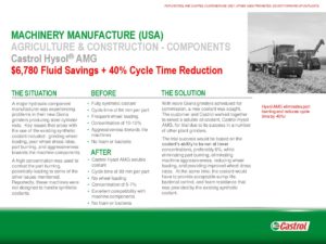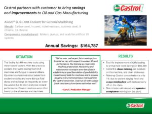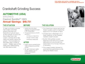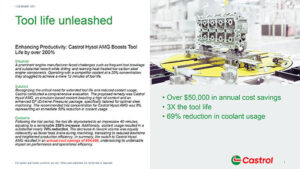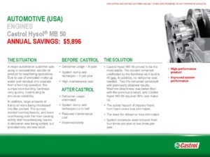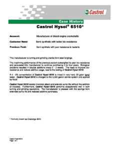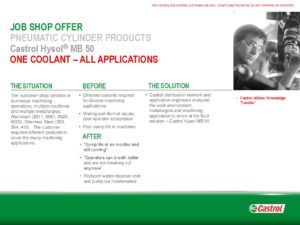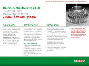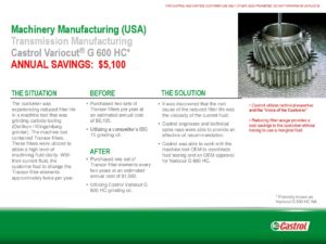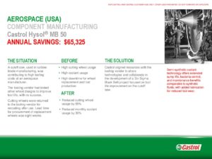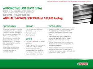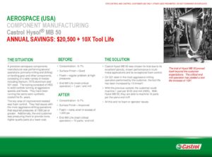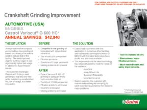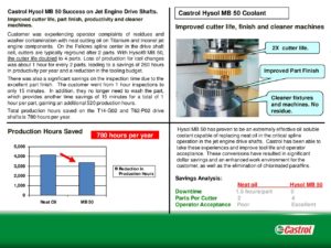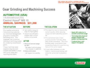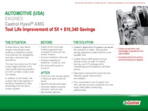 Tool life extended by over 200% helps boost productivity - Castrol® Hysol® AMGTool-life-extended-by-over-200-percent Application: Carbide, Grinding, High speed, aggressive grinding, tools, inserts, neat oil Key Benefits: Eliminated smoke, lower mist, improved grinding production, greater depth of grind, improved safety (higher flash), longer sump life. |