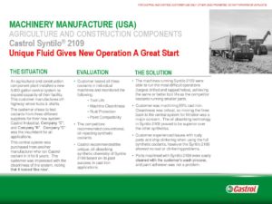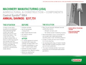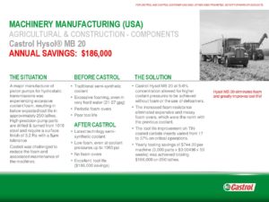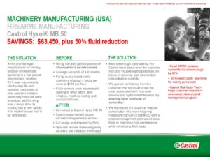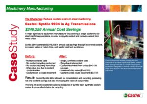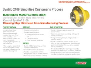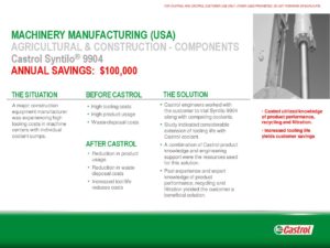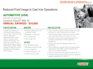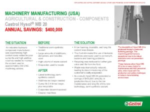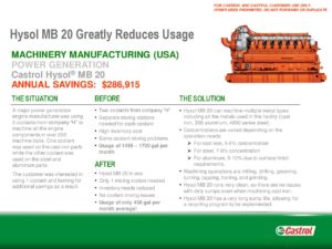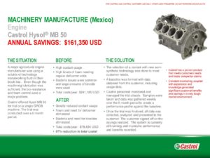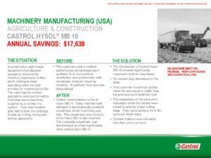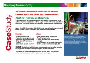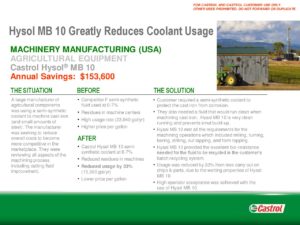 Hysol MB 10Hysol MB 10 (Agriculture) Cast Iron Components CS-MMAC-116 Application: Milling, Turning, Boring, Drilling, Cut tapping, Form tapping, Cast Iron (90%), Steel (10%), Axle housing, Haas, VR, Okuma, Doosan, Mori Seiki, Belt skimmers, Centrifuge, canister filters at 10 micron Key Benefits: Lower price, lower usage |