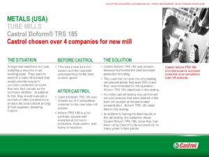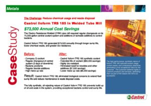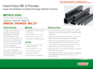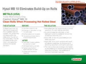Hysol MB 10Hysol MB 10 (Tube Mill) Welded Tube Mill Coolant CS-MTTM-117 Application: Tube forming, Hot rolled steel, Welded steel tube Key Benefits: Eliminated roll build-up, eliminated tube surface defects, eliminated corrosion, overall cleaner system. |