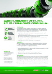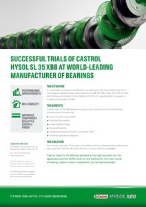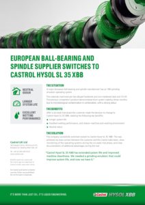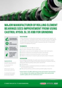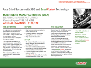 Hysol SL 36 XBB + SmartControl (Machinery Manufacture) Steel Race Grinding CS-MMBR-113Hysol SL 36 XBB + SmartControl (Machinery Manufacture) Steel Race Grinding CS-MMBR-113 Application: Race grinding, cage milling, steel, bearing rings, CV joint yokes, CV joint cages Key Benefits: Lower usage, neat oil replacement, lower mist, less slip hazard, safety improvement, low foam, longer sump life |