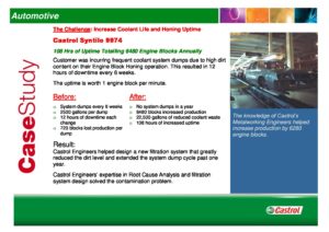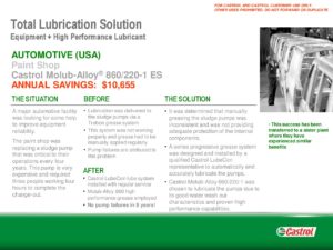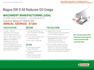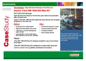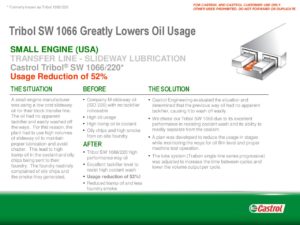 Tribol SW 1066/220 (fka Tribol 1066/220)Tribol SW 1066-220 (Small Engine) Slideway Usage Reduction CS-MMSE-102 Application: Single line series progressive, Central system feeding multiple machines, Part transfer line Key Benefits: Usage reduction, less tramp oil in coolant. |