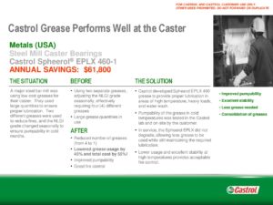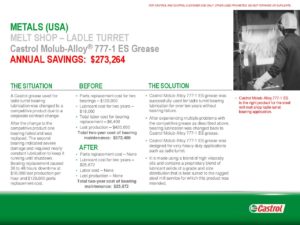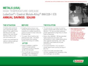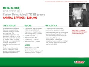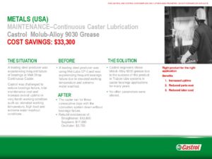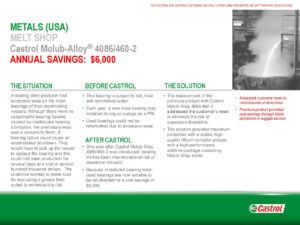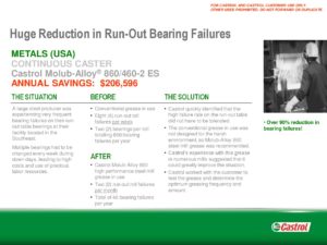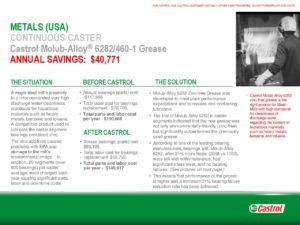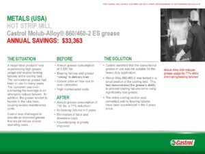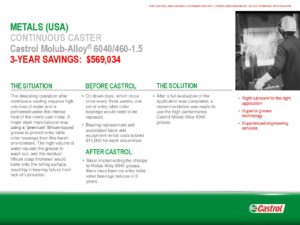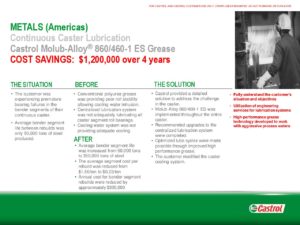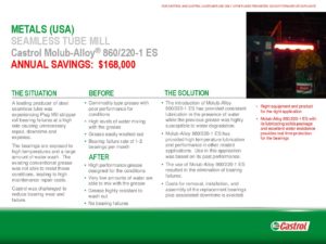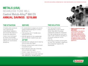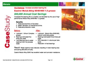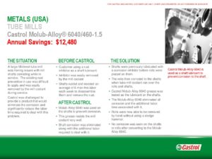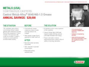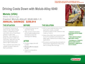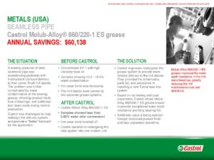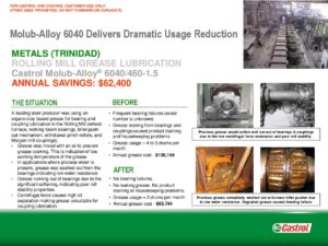Molub-Alloy 6040/460-1.5Molub-Alloy 6040-460-1.5 (Metals) Weld Bearings CS-MTTM-123 Application: Weld bearings for pipe mill, water wash, high temps Key Benefits: Longer bearing life, lower grease usage, reduced downtime, lower labor costs, less maintenance costs. |