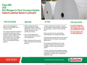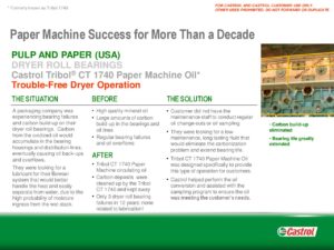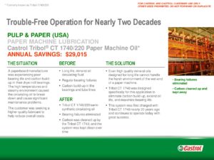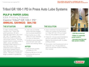 Tribol GR 100-1 PD (fka Longtime PD 1)Tribol GR 100-1 PD (Pulp and Paper) Printing Press Central Lube CS-MCPP-103 Application: Bielomatik series progressive system, Central lube system, Bearings, rollers, cams, & slides on printing presses (7 huge KBA presses), Presses: KBA; Lube sys: Bielomatik Key Benefits: Reduced bearing failures, reduced downtime, reduced lube system issues. |
