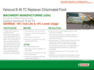 Variocut B 46 TCVariocut B 46 TC (Firearms Manufacturing) Machining Titanium CS-MMOT-114 Application: Titanium 6AL4V Key Benefits: Better tool life, lower usage, no chlorine, lighter color, better odor. |