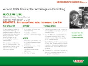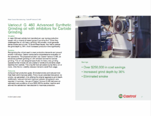 Variocut G 460 Advanced Synthetic Grinding oil with inhibitors for Carbide GrindingVariocut G460 Case Study Application: Carbide, Grinding, High speed, aggressive grinding, tools, inserts, neat oil Key Benefits: Eliminated smoke, lower mist, improved grinding production, greater depth of grind, improved safety (higher flash), longer sump life |