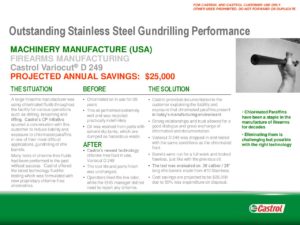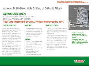 Variocut D 249Variocut D 249 (Aerospace) Aerospace Metals BTA Gundrilling CS-AEAE-112 Application: BTA style gundrilling, Titanium, Inconel, Monel, Stainless 300 series, Aluminum, Aerospace components, Mollart Key Benefits: Better tool life, better finish, eliminated chlorine. |