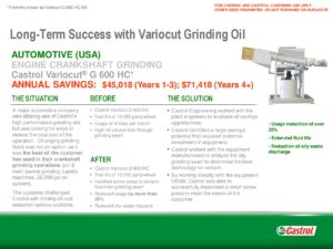 Variocut G 600 HC (fka Variocut G 600 HC NA)Variocut G 600 HC (Automotive) Grinding Steel Crankshafts CS-AUEN-126 Application: Pin and main journal grinding from rough forging, Steel, Crankshafts, Landis grinders; Chip Systems International (swarf press), Mann & Hummel with powder media Key Benefits: Highest performing grinding fluid they have used, lowered usage through recycling |