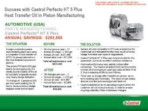 Perfecto HT 5 Plus CS-AUPM-103Perfecto HT 5 Plus (Automotive) Piston Heat Transfer Oil CS-AUPM-103 Application: Heat transfer oil for heat treatment of parts Key Benefits: Longer oil life, reduced usage, lower maintenance costs, eliminated sludge, eliminated tank cleaning, reduced labor costs. |