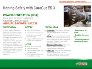 CareCut ES 3CareCut ES 3 (Power Gen) Honing Steel Alloy Turbine Housings CS-MMOT-135 Application: Honing alloy steel CrMoV turbine housing disks Key Benefits: Longer sump life, lower oil usage, longer filter life, reduced maintenance, reduced downtime, lower price per gallon, higher flash point, improved safety |