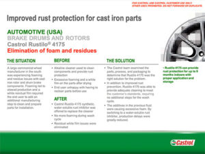 Rustilo 4175 (Automotive) Cast Iron Brake Drums and Rotors CS-AUWH-108Rustilo 4175 (Automotive) Cast Iron Brake Drums and Rotors CS-AUWH-108 Application: Final washer, single stage washer, cast iron, brake drums, brake rotors, cleaning, rust protection, RP Key Benefits: Foam elimination, residue elimination, corrosion elimination, rust elimination, white film elimination, dry-film, fast drying |