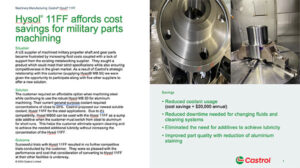 Hysol® 11FF provides cost savings for military parts machiningHysol 11 FF (Machinery Manufacture) Steel Prop Shafts and Gears CS-MMAC-118 Application: Steel, cast iron, Drilling, Form Tapping, Milling, Reaming, Power Transmission Components Key Benefits: Lower price per gal, less need to dump, eliminated lubricity additive, reduced staining, improved part quality, good recycling ability, lower mist, lower skin irritation, improved operator acceptance |