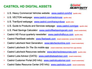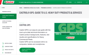 Websites AllPassenger CarHeavy DutyGeneral Castrol SDS & PDS Repository Visit Website Castrol USA Visit Website Login required. Castrol Street View Visit Website Login required. IMI / Castrol SCORE Rewards Visit Website Login required. The Learning Campus Visit Website Login required. Castrol Customer Portal Visit Website Castrol YouTube Channel Visit Website Castrol Oil Selector Visit Website Login required. Castrol DriveOn Visit Website Login required. Castrol® ePODS™ Visit Website Castrol HD Website Visit Website Castrol Guide to Product and Services (GPS) Visit Website Login required. Castrol Labcheck Website Visit Website Castrol Labcheck Training Visit Website DES-Case and Castrol Website Visit Website Login required. Castrol Lube Advisor (OATS) Visit Website Fleet Savings CalculatorProvides prospects with potential savings by switching to Ca... View Page Castrol HD Digital Assets Download File Castrol USA HD LinkedIn Visit Site